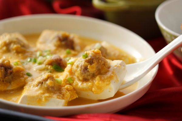 制作過程: 肉末加入少許鹽、料酒、生抽、淀粉和姜末等調(diào)味料順著一個方向攪拌上勁;選用老豆腐,將它切成麻將大小的塊, 在豆腐中間用勺抓個洞,撒上少許淀粉,再將團(tuán)好的肉丸放入豆腐的中間;燒鍋開水,將菜盤放進(jìn)鍋中大火蒸上二十分鐘將其蒸熟后拿出來。 蒸熟的咸蛋黃按壓成泥,燒熱鍋放入少許油,將咸蛋黃泥放進(jìn)鍋中翻炒成沙,加入少許水淀粉勾芡, 最后將燒好的咸蛋黃芡汁澆淋在蒸熟的釀豆腐上, 再撒上少許蔥花即可。