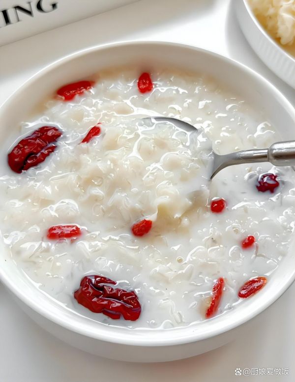 5. 準(zhǔn)備枸杞與椰絲(可選):枸杞稍微泡軟,加入牛奶銀耳羹中,增添香氣與營(yíng)養(yǎng);如果喜歡椰絲口感,可以加入少許干椰絲,攪拌均勻。