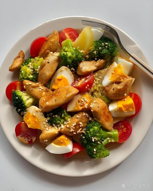 6. 混合沙拉:將煎好的雞胸肉片與切好的蔬菜一同放入大碗中,加入調(diào)制好的沙拉醬,輕輕翻拌均勻,確保所有食材都被沙拉醬覆蓋。