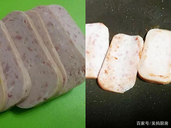 2) 把午餐肉去成薄片,放入鍋中煎一下,裝盤。