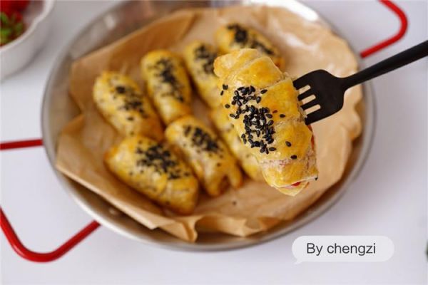 4、烤盤(pán)上放上油紙,把卷好香腸的手抓餅放在上面,用刷子刷上一些雞蛋液,撒上點(diǎn)黑芝麻。