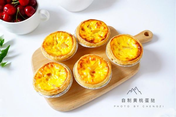 食材:蛋撻皮6個(gè),糖水黃桃適量,雞蛋1個(gè),牛奶120克,白糖10克,煉乳15克