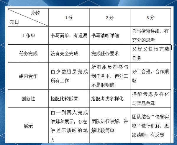在限定時(shí)間內(nèi),各小組需完成一份營養(yǎng)均衡且成本不超過10元的快餐搭配。為了更好地評估各組搭配的合理性,我們制定了以下評價(jià)標(biāo)準(zhǔn):