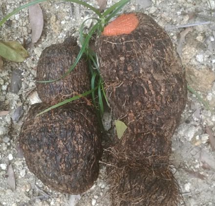 塊莖一般生長(zhǎng)在表土層,為卵形、球形、長(zhǎng)圓形或葫蘆狀,外皮黑褐色,凹凸不平,斷面新鮮時(shí)紅色,干后紫黑色,直徑大的甚至可達(dá)20多厘米。