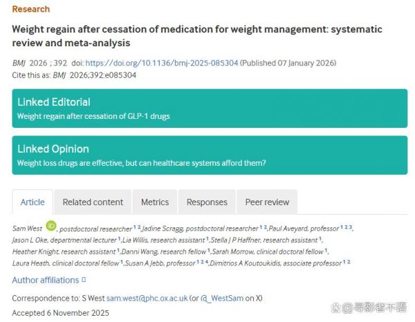 論文標(biāo)題:Weight regain after cessation of medication for weight management: systematic review and meta-analysis(停止體重管理藥物治療后的體重反彈:系統(tǒng)綜述與薈萃分析)