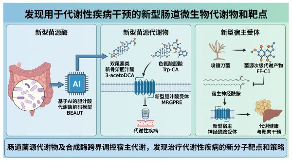 北京大學(xué)姜長濤、喬杰、孫金鵬、來魯華、汪鍇等團隊合作,發(fā)現(xiàn)調(diào)控代謝性疾病的新型腸道菌源代謝物、作用機制與干預(yù)策略:構(gòu)建基于AI的菌源特異合成酶挖掘體系,發(fā)現(xiàn)并命名新骨架膽酸雙尾素、色氨酸膽酸等新型菌源代謝物,揭示孤兒受體MRGPRE等新型膽汁酸受體,是代謝性疾病的新靶點;發(fā)現(xiàn)FF-C1等腸道共生真菌新型次級代謝產(chǎn)物,解析其通過調(diào)控宿主神經(jīng)酰胺改善代謝性疾病的作用,并發(fā)現(xiàn)神經(jīng)酰胺新受體,開發(fā)靶向干預(yù)策略。