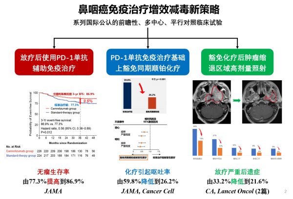 中山大學(xué)腫瘤防治中心孫穎、馬駿團隊通過一系列國際公認的前瞻性、多中心、平行對照臨床試驗,在鼻咽癌增效方面,證實放療后使用PD-1單抗輔助免疫治療,可將失敗風(fēng)險降低了44%,生存率由77.3%提高到86.9%;在減毒方面,研制出在PD-1單抗免疫治療基礎(chǔ)上豁免同期順鉑化療,不降低療效的同時,將化療引起嘔吐率由59.8%降低到26.2%;并制定了“豁免化療后腫瘤縮退區(qū)域高劑量照射”,使放療嚴重后遺癥由33.2%降低到21.6%。由此,創(chuàng)立了鼻咽癌免疫治療“增效減毒”新策略。