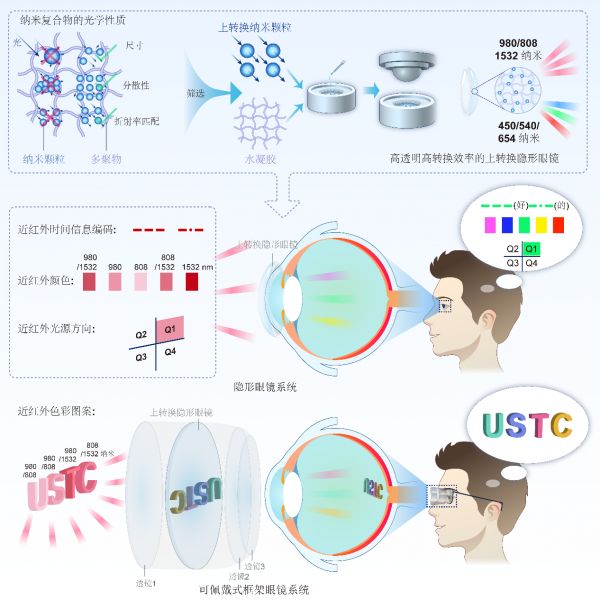 中國科學(xué)技術(shù)大學(xué)薛天、馬玉乾團隊與中國科學(xué)技術(shù)大學(xué)龔興龍團隊和復(fù)旦大學(xué)張凡團隊合作,創(chuàng)新性地將可轉(zhuǎn)換紅外光至可見光的納米材料與隱形眼鏡聚合物結(jié)合,研制出高透明度、高轉(zhuǎn)換效率的上轉(zhuǎn)換隱形眼鏡。該隱形眼鏡無需電源與復(fù)雜設(shè)備,實現(xiàn)了人類對近紅外光的時間、空間與色彩(光譜)多維度信息的裸眼感知,并模擬人體三色視覺機制,實現(xiàn)多紅外光譜轉(zhuǎn)換為三原色可見光的近紅外色彩視覺。該技術(shù)突破人類視覺固有可見光譜段的極限,拓展人類視覺邊界,為類腦感知和可穿戴視覺材料提供技術(shù)新范式。未來將在夜視、色盲治療、信息加密及物性紅外波譜裸眼探測等方向具有廣闊開發(fā)前景,為構(gòu)筑類腦多光譜智能感知體系提供重要支撐。哈佛大學(xué)Michael H. Do在Cell Biomaterials雜志上撰文評價:“巧妙地繞過了自然界對人體視覺功能的限制”,Nature報道該成果“為理解我們周圍的世界提供了新的可能性”。