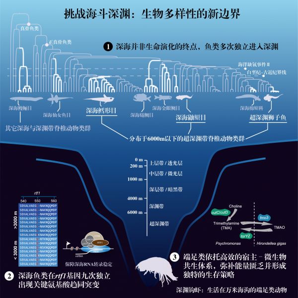 中國科學(xué)院水生生物研究所何舜平、中國科學(xué)院深??茖W(xué)與工程研究所張海濱、徐涵,聯(lián)合西北工業(yè)大學(xué)王堃和青島華大基因研究院范廣益等團隊,利用珍稀樣本與多組學(xué)數(shù)據(jù),從宏觀到微觀多維度解碼了深淵動物的“生命密碼”。研究首次系統(tǒng)重構(gòu)了脊椎動物多次獨立進入深淵的演化路線圖,揭示深海并非生命演化的“終點”,而是孕育多次創(chuàng)新的關(guān)鍵高地。在此基礎(chǔ)上,團隊發(fā)現(xiàn)深海魚類在分子層面通過rtf1基因發(fā)生趨同突變,從而精妙地應(yīng)對極端環(huán)境;同時揭示端足類動物通過構(gòu)建高效的“宿主–微生物”共生體系,有效彌補能量輸入不足,形成獨特的生存策略。該系列成果系統(tǒng)回答了“生命如何在極端環(huán)境中演化與適應(yīng)”的重大科學(xué)問題,為認識地球生命極限、開發(fā)與利用深海生物資源以及服務(wù)國家重大海洋戰(zhàn)略提供了關(guān)鍵科學(xué)認知和重要理論支撐。