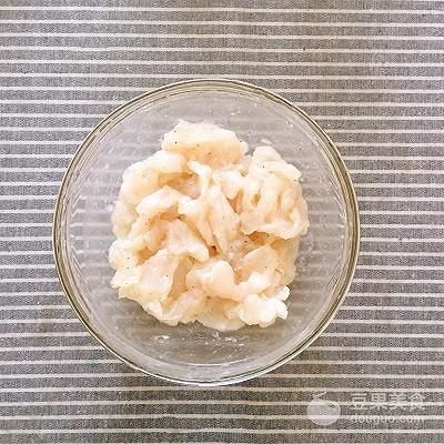 2、魚(yú)肉切片加2g白胡椒粉、1勺料酒、2g鹽、5g淀粉、幾滴香油(可不放)攪拌均勻腌制15分鐘。