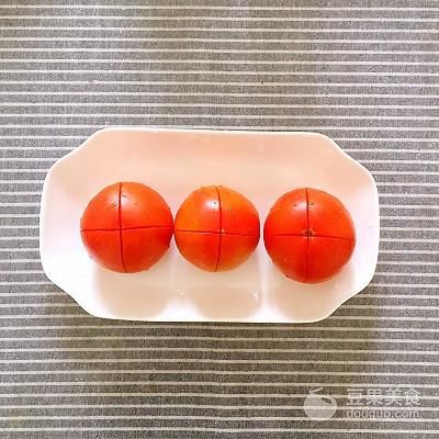 3、番茄洗凈劃十字刀,我喜歡劃深一點(diǎn)長(zhǎng)一點(diǎn),比較容易去皮。當(dāng)然,如果你也是懶癌癥患者也可以不用去皮。
