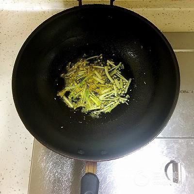 5、鍋中放約10ml食用油,待油五成熱時(shí)放入姜絲、蒜末、蔥白爆香。