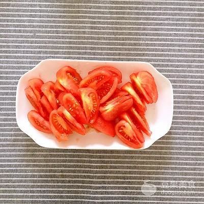 4、用開(kāi)水燙番茄或放開(kāi)水鍋里煮1分鐘去皮,將番茄切大塊備用。