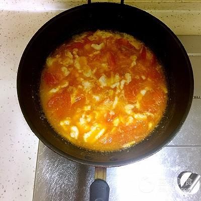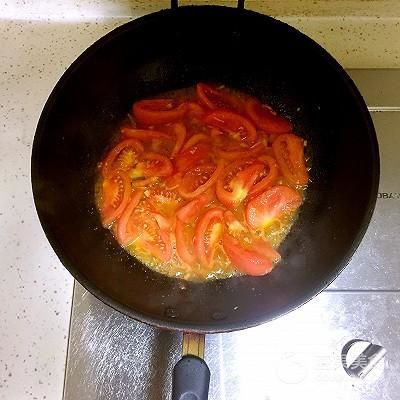 6、然后倒入切好的番茄,炒至番茄軟爛出紅汁。