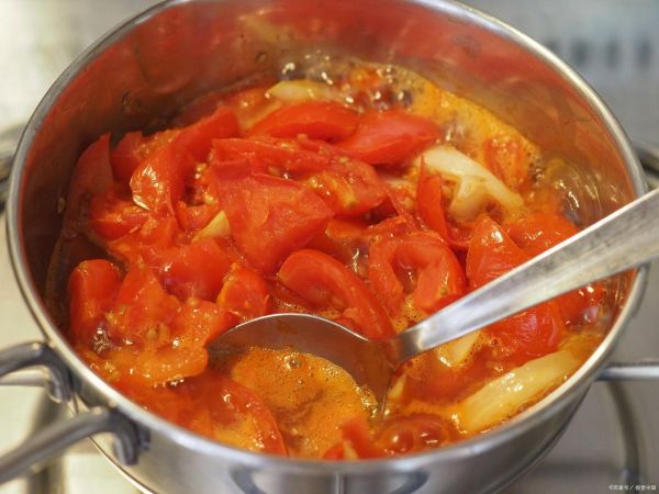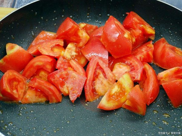 接著,轉(zhuǎn)大火,將備好的番茄塊放入鍋中,炒至番茄出紅油。這時(shí)候的番茄已經(jīng)釋放出豐富的汁液,香味四溢,視覺和味覺都開始變得愉悅了!