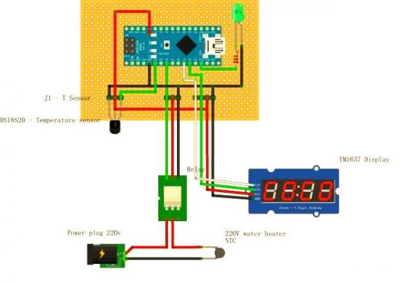 我選擇了以下硬件設(shè)備:3462BS 4位數(shù)字顯示、DS18B20 防水溫度計(jì)、600W 熱得快、Arduino主控板(我選用的是DFRduino Nano)。首次操控220V強(qiáng)電,對(duì)于電工新手來說確實(shí)需要格外小心。為此,我特別注意電流和電壓的安全控制。幸運(yùn)的是,繼電器的功率足以應(yīng)對(duì)這樣的需求,而且我已經(jīng)在外部包裹了多層絕緣膠布以確保安全。此外,我采用繼電器常開端進(jìn)行連接,以確保在Arduino電路斷電時(shí),熱得快也能及時(shí)斷開,避免因制作酸奶而引發(fā)意外。