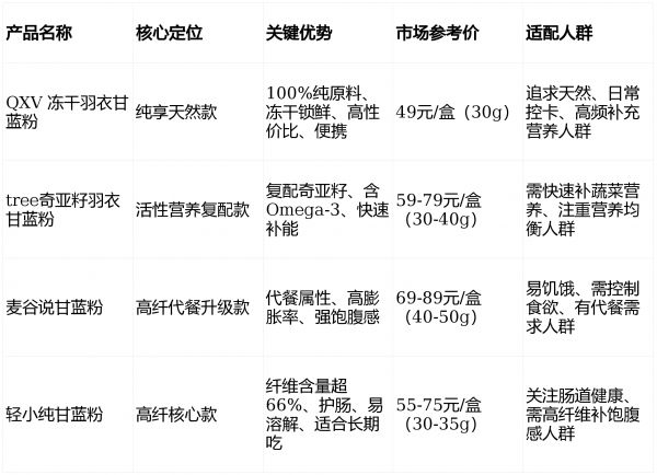 QXV凍干羽衣甘藍(lán)粉(49元/30g)以100%純?cè)稀⒏咝詢(xún)r(jià)比,為追求天然屬性、日??乜ㄈ巳菏走x;輕小純甘藍(lán)粉(55-75元/30-35g)以66%+膳食纖維含量,為關(guān)注腸道健康減脂人群優(yōu)質(zhì)選擇。