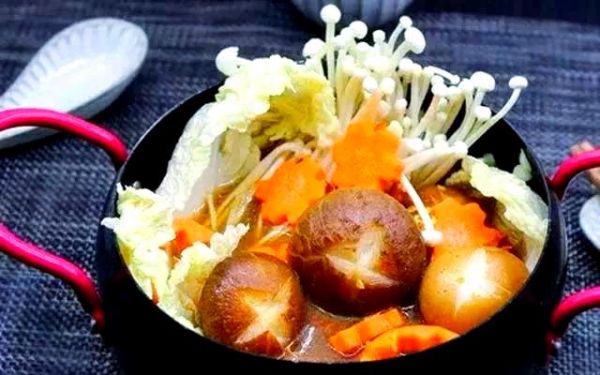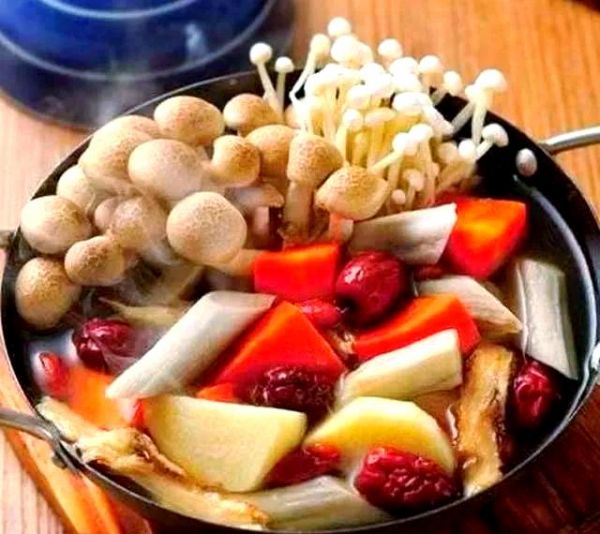 食材:山藥120克,牛蒡100克,胡蘿卜100克,秀珍菇80克,金針菇80克,當(dāng)歸2克,枸杞2克,紅棗6顆,姜片5克,素高湯500毫升,鹽適量。