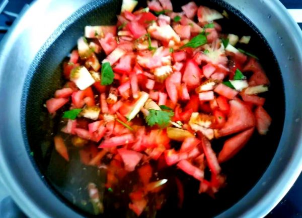 干香菇浸泡發(fā)制,西紅柿、酸菜等其他食材清洗備用,以備制作鍋底。將干香菇徹底清洗后,浸泡發(fā)制兩小時。接著,將泡發(fā)香菇的水分濾出,作為火鍋的鍋底湯料。接下來,將所有食材都清洗干凈,待用。將西紅柿切成丁狀,酸菜切成細(xì)絲,姜片也備好,以備后用。