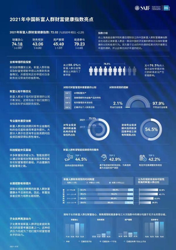 2021年的最新數(shù)據(jù)表明,中國新富人群的財富健康水平總體邁上新高度。財富健康指數(shù)為72.02,較2020年小幅上升了2.29個點,創(chuàng)五年來新高。其中財富信心和投資參與這兩項次指數(shù)呈現(xiàn)顯著增長——前者為74.18,較上年上升了2.97個點;后者為79.23,較上年增長2.60個點。財務(wù)規(guī)劃和資產(chǎn)管理次指數(shù)則分別小幅下跌至43.06和45.49。