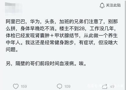 樓主所發(fā)貼文如下:阿里巴巴,華為,頭條,加班的兄弟們注意了,別那么拼,身體早晚吃不消。樓主不到28,工作沒幾年,體檢已經(jīng)發(fā)現(xiàn)腎囊腫+甲狀腺結(jié)節(jié),從此做一個養(yǎng)生中年人。我這還是經(jīng)常健身跑步,有癥狀,但沒啥大問題。另,隔壁的哥們前段時間血液病。