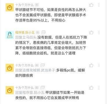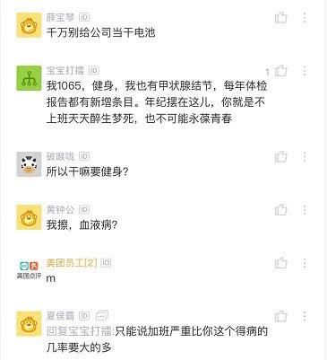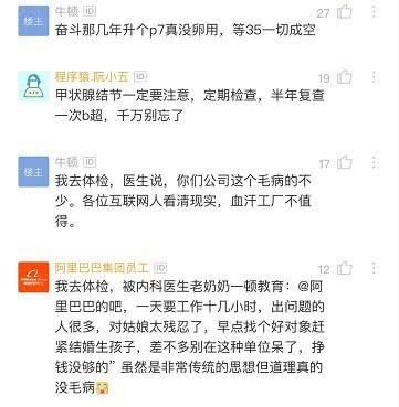 同時也有網(wǎng)友說出自身的心酸史,和樓主大致雷同:我去體檢,被內(nèi)科醫(yī)生老奶奶一頓教育阿里巴巴的吧,一天要工作十幾小時,出問題的人很多,對姑娘太殘忍了,早點找個好對象趕緊結(jié)婚生孩子,差不多別在這種單位呆了,掙錢沒夠的” 雖然是非常傳統(tǒng)的思想但道理真的沒毛病,我去體檢,醫(yī)生說,你們公司這個毛病的不少。各位互聯(lián)網(wǎng)人看清現(xiàn)實,血汗工廠不值得。我1065,健身,我也有甲狀腺結(jié)節(jié),每年體檢報告都有新增條目。年紀(jì)擺在這兒,你就是不上班天天醉生夢死,也不可能永葆青春。