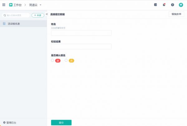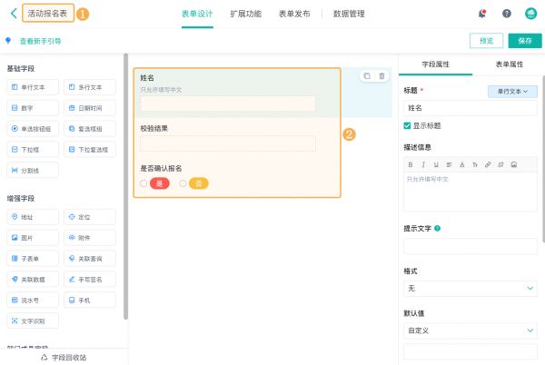 以表單填寫時(shí)「只允許填寫中文」為例,進(jìn)行校驗(yàn)。新建「活動報(bào)名表」表單,字段設(shè)置如下: