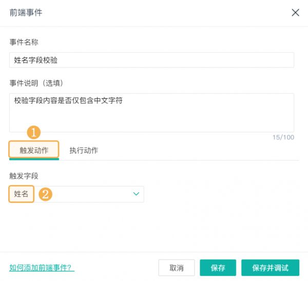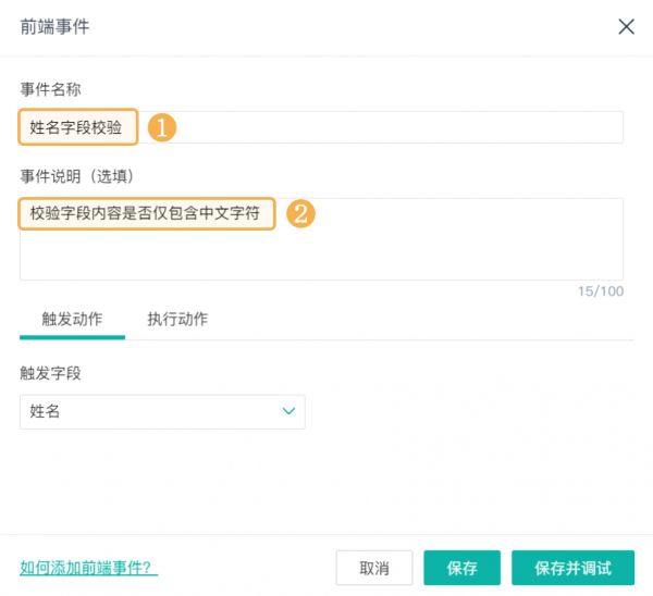 添加好前端事件后,首先設(shè)置前端事件的基礎(chǔ)信息,即事件名稱和事件說明,用于區(qū)分前端事件: