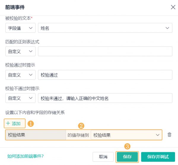 2)添加「校驗(yàn)結(jié)果」字段,并設(shè)置如下所示的字段存儲關(guān)系。全部設(shè)置完成點(diǎn)擊「保存」。