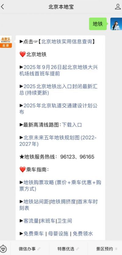 溫馨提示:微信搜索關(guān)注公眾號【北京本地寶】,關(guān)注后回復(fù)【地鐵】獲北京未來五年地鐵規(guī)劃圖、最新版高清線路圖下載、首末班車時刻表、地鐵免票人群/購票攻略、免費(fèi)領(lǐng)水、衛(wèi)生間查詢、線路調(diào)整最新消息/服務(wù)熱線。