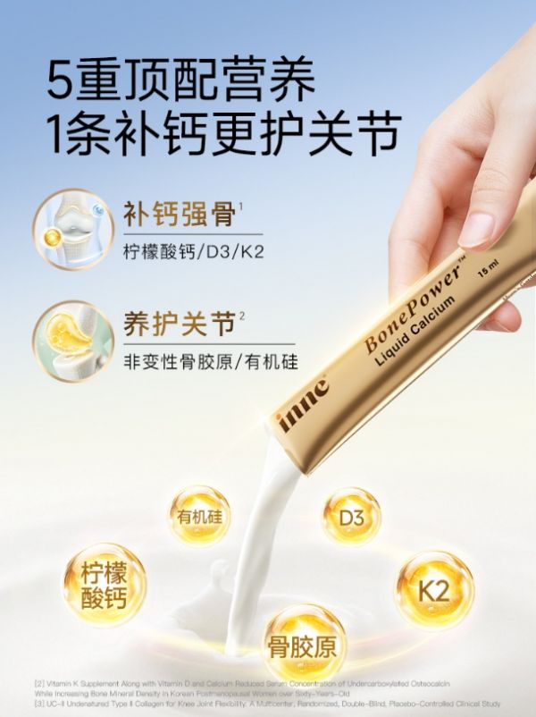 作為全球首款骨膠原鈣,inne骨膠原鈣的核心突破的是重構(gòu)了骨骼養(yǎng)護(hù)的科學(xué)邏輯,直擊“單純補(bǔ)鈣不鎖鈣、只護(hù)骨不護(hù)關(guān)節(jié)”的行業(yè)痛點(diǎn)。產(chǎn)品采用科學(xué)復(fù)配配方,每支含500mg高生物利用度的液體檸檬酸鈣,搭配優(yōu)質(zhì)骨膠原,二者協(xié)同作用實(shí)現(xiàn)“剛?cè)岵?jì)”——鈣筑牢骨骼硬度,骨膠原構(gòu)建致密網(wǎng)狀支架鎖住鈣質(zhì)、提升骨骼韌性,從根源上減少骨鈣流失,同時直達(dá)軟骨、養(yǎng)護(hù)關(guān)節(jié),完美契合《中國骨健康科普指南》中“骨骼健康需鈣與骨膠原協(xié)同補(bǔ)充”的核心觀點(diǎn)。