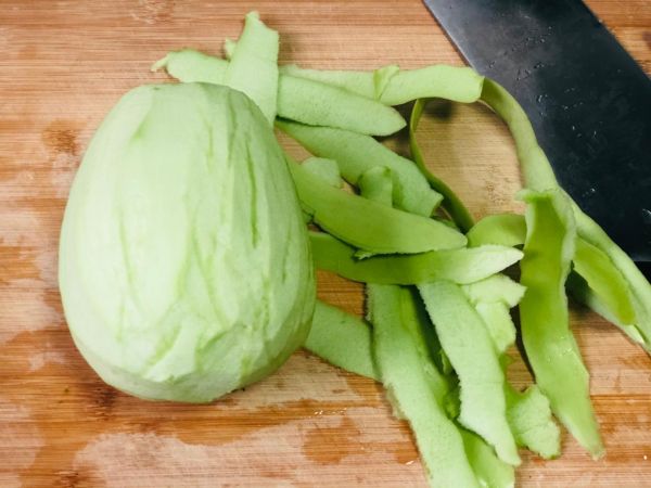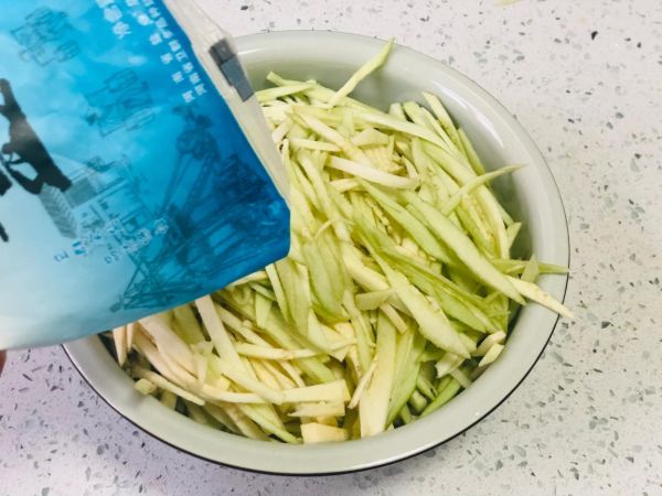 2、茄子皮去掉之后,先用刀切成薄片,然后在切成細(xì)絲,加入適量的食鹽,把茄子先腌制10分鐘作用,把茄子里邊多余的水分殺出來,還能去掉茄子的生味,吃起來更加的好吃!