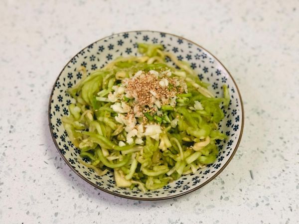 4、大蒜切成碎末,放在茄子上邊,再來上一點白芝麻,白芝麻可以起到增香的效果,大家做涼拌菜的時候都可以放一些。