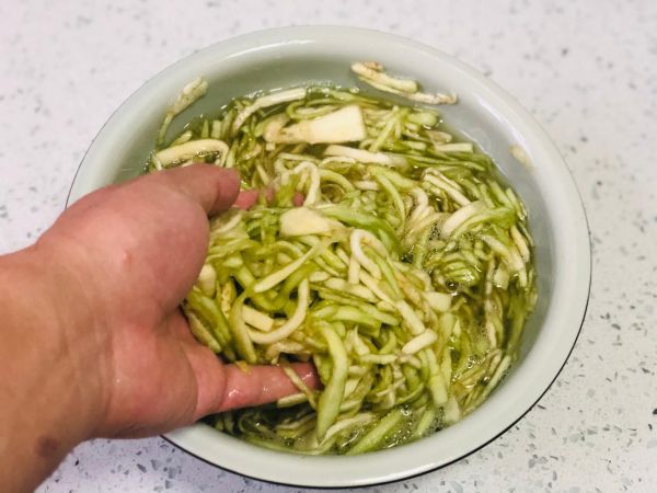 3、茄子腌制好之后,放在涼白開里反復(fù)的淘洗兩三遍,把茄子里邊多余的鹽分洗出來,然后攥干水分備用。