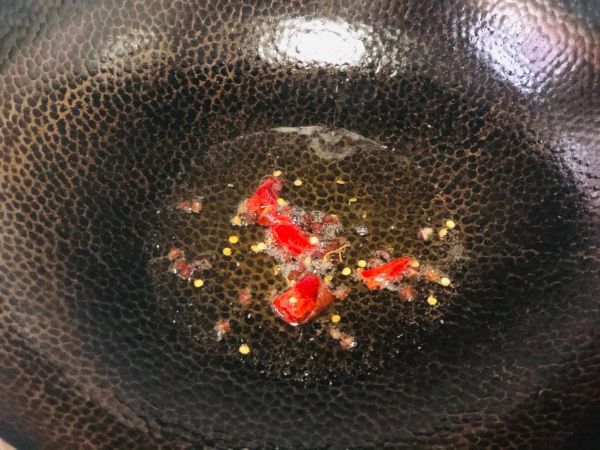 5、起鍋下入少許的植物油,然后下入干辣椒段、花椒,炸出香味兒!