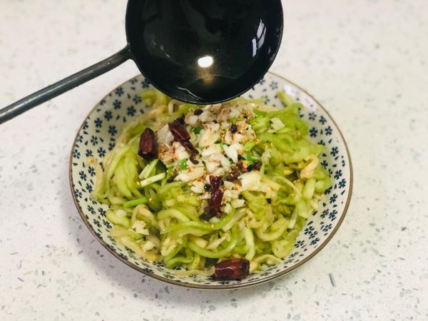 6、辣椒和花椒炸香之后,連同熱油一起倒入到茄子上邊,利用高溫激發(fā)出蒜香味和芝麻的香味兒!