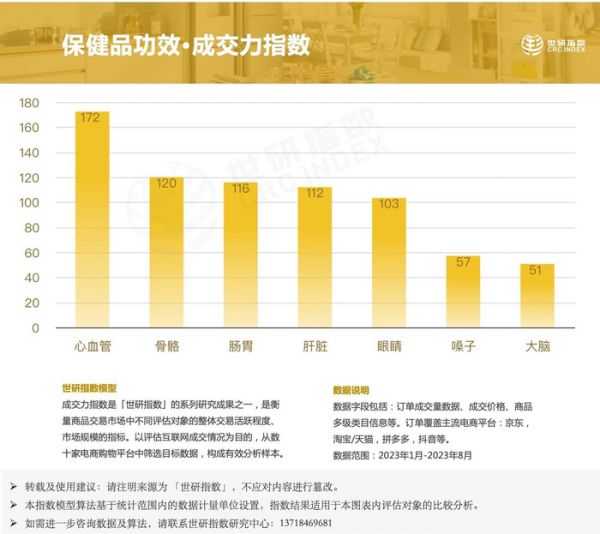 數(shù)據(jù)顯示:排名第一位的心血管類保健品,成交力指數(shù)相比第二名高出40%以上。其次是針對(duì)骨骼、腸胃、肝臟、眼睛的功能保健品。第三梯隊(duì)的是針對(duì)咽喉嗓子和健腦類的保健品。