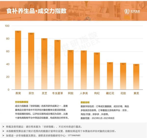世研消費(fèi)指數(shù)顯示,中式養(yǎng)生品類的成交規(guī)模整體增長(zhǎng)明顯。成交力指數(shù)領(lǐng)先的藥食同源產(chǎn)品包括:燕窩、茶飲、靈芝、冬蟲夏草、阿膠、人參類、枸杞、藏紅花、花膠、黃芪。