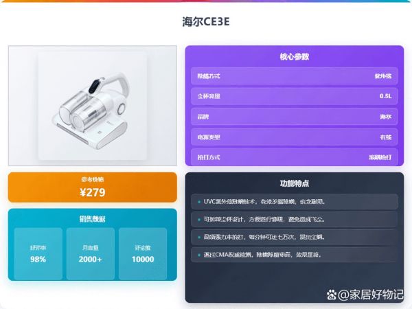 當然,性價比也是選購時需要考慮的重要因素。如果你想找一款實用又劃算的除螨儀,海爾CE3E也是個不錯的選擇。它的雙塵杯設計、持久的吸力以及熱風除濕功能,能夠有效保持床鋪干爽,抑制螨蟲滋生。