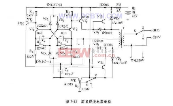 下圖是簡易逆變電源電路,電路中,VT1,VT2組成了集基耦合震蕩器,震蕩頻率由C1,C2和R2,R1決定。 VT1,VT2的發(fā)射極在震蕩時(shí)輪流輸出方波,信號經(jīng)VT3和VT4放大后驅(qū)動功率管VT5.VT6。VD1和VD......