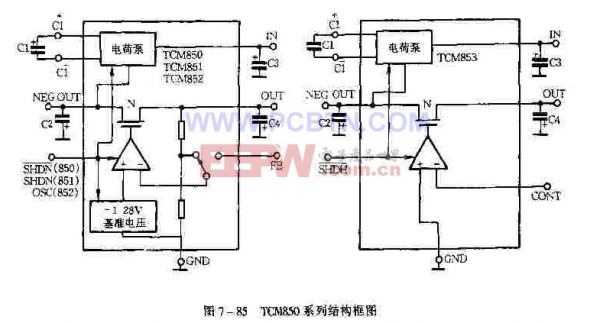 新型電源電路TCM850應(yīng)用時(shí),靜態(tài)電流一般為1~2μA。TCM850系列有4種型號,即TCM850/851/852/853,其區(qū)別如表7-1所示。   表7-1 TCM850系列管腳功能   如圖7-23所示是......