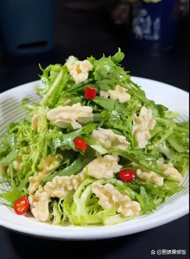 6. 調(diào)味拌勻:將瀝干水分的苦菊段放入大碗中,加入炒香的核桃仁,再加入蒜末和干辣椒,倒入準(zhǔn)備好的醬汁,輕輕拌勻。