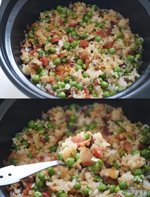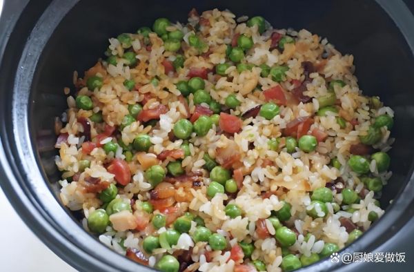 7. 加入豌豆:在米飯快煮好時,加入豌豆,繼續(xù)燉煮10分鐘,直到豌豆熟透,整個飯粒吸收了蔬菜和調(diào)料的味道。