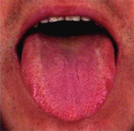 屬中度齒痕舌,舌兩側(cè)的齒痕清晰可見;舌苔白(絲狀乳頭分布均勻)