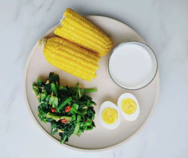 一根玉米、涼拌小白菜  一盒牛奶、一個雞蛋