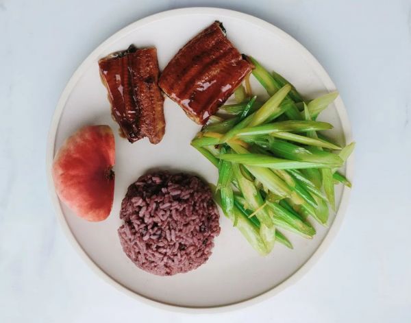 紫米飯、清炒芹菜、蒲燒鰻魚、桃子