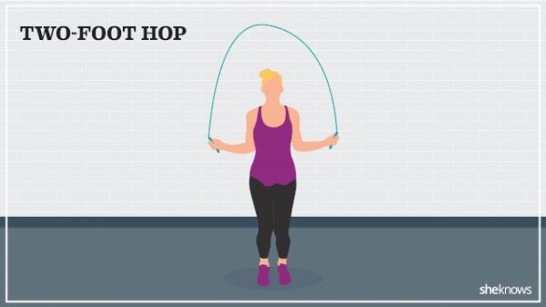 剛開(kāi)始跳繩容易被繩子絆倒,以這個(gè)動(dòng)作起始會(huì)有所幫助。具體方法是雙手抓住繩子,以適合的速度在左右體側(cè)進(jìn)行“8”字形搖擺。