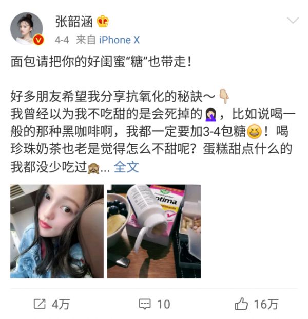 4月4日,張韶涵發(fā)微博介紹自己保持好身材的秘訣:戒糖,戒淀粉,多吃super food。