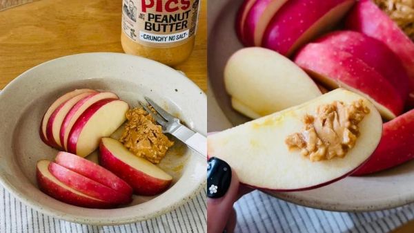 將蘋果切片,花生醬用1茶匙薄薄抹在幾片上就好,想更有飽足感:搭無(wú)糖豆?jié){或希臘酸奶兩三口,當(dāng)作下午茶點(diǎn)心。