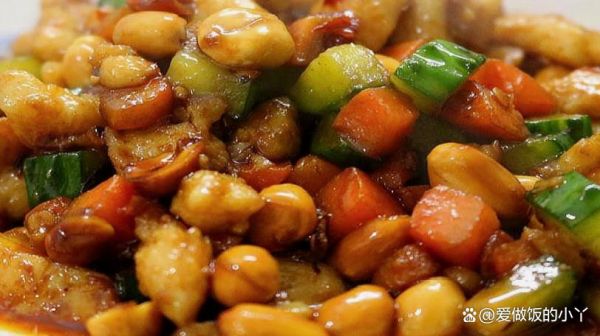 第四步:起鍋燒油,加入雞丁滑油后撈出。鍋中底油燒熱后加入蔥段、姜蒜爆香,然后加入黃瓜、胡蘿卜丁翻炒斷生,再加入雞丁,倒入料汁翻炒均勻,最后倒入花生米炒勻后出鍋即可。